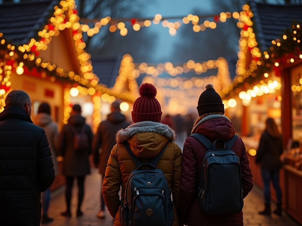 Polska rodzina spaceruje po jarmarku świątecznym w Wielkiej Brytanii wieczorem, otoczona światełkami i straganami